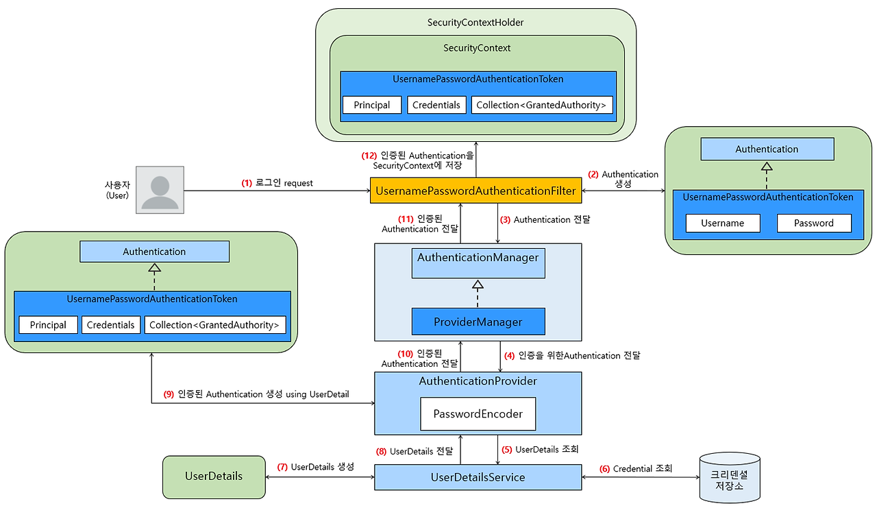 먼저 (1)에서 사용자가 로그인 폼 등을 이용해 Username(로그인 ID)과 Password를 포함한 request를 Spring Security가 적용된 애플리케이션에 전송합니다.Spring Security에서의 실질적인 인증 처리는 지금부터가 시작입니다.